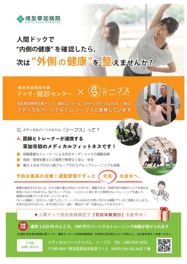 この度、メディカルパーソナルジム シープスは、埼友草加病院付属 ドック・健診センター様と正式に提携させていただくこととなりました!